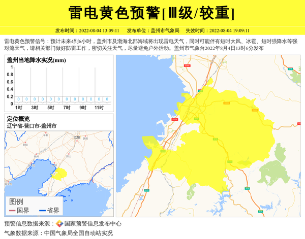 雷电黄色预警信号:预计未来4到6小时,盖州市及渤海北部海域将出现雷电天气,同时可能伴有短时大风、冰雹、短时强降水等强对流天气,请相关部门做好防雷工作,密切关注天气,尽量避免户外活动。盖州市气象台2022年8月4日13时6分发布 信息来源:国家预警信息发布中心; 发布单位:盖州市气象局。