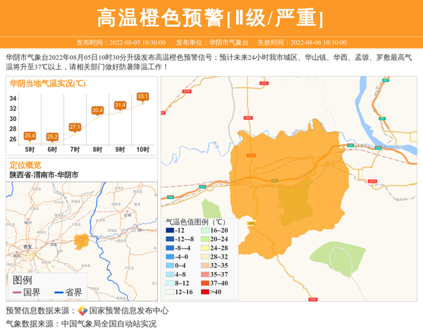 华阴市气象台2022年08月05日10时30分升级发布高温橙色预警信号:预计未来24小时我市城区、华山镇、华西、孟塬、罗敷最高气温将升至37℃以上,请相关部门做好防暑降温工作! 信息来源:国家预警信息发布中心; 发布单位:华阴市气象台。