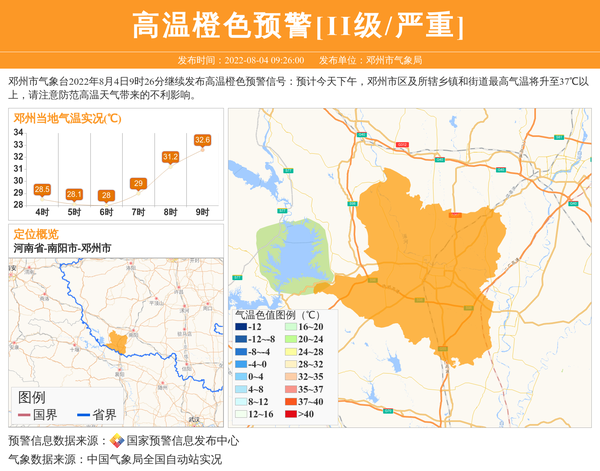 邓州市气象台2022年8月4日9时26分继续发布高温橙色预警信号:预计今天下午,邓州市区及所辖乡镇和街道最高气温将升至37℃以上,请注意防范高温天气带来的不利影响。 信息来源:国家预警信息发布中心; 发布单位:邓州市气象局。