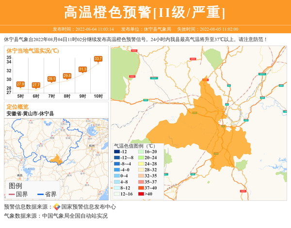 休宁县气象台2022年08月04日11时02分继续发布高温橙色预警信号。24小时内我县最高气温将升至37℃以上。请注意防范! 信息来源:国家预警信息发布中心; 发布单位:休宁县气象局。