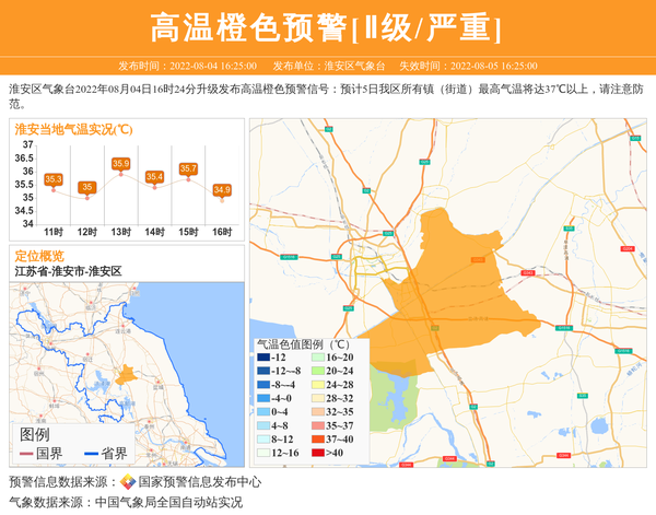 淮安区气象台2022年08月04日16时24分升级发布高温橙色预警信号:预计5日我区所有镇(街道)最高气温将达37℃以上,请注意防范。 信息来源:国家预警信息发布中心; 发布单位:淮安区气象台。