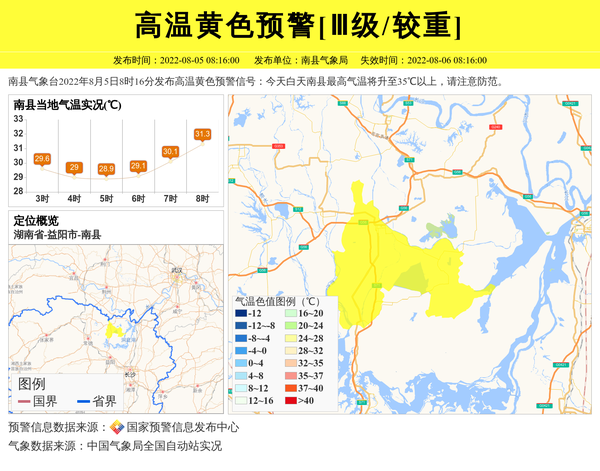 南县气象台2022年8月5日8时16分发布高温黄色预警信号:今天白天南县最高气温将升至35℃以上,请注意防范。 信息来源:国家预警信息发布中心; 发布单位:南县气象局。