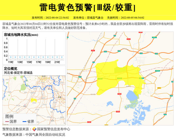 容城县气象台2022年08月04日22时52分发布雷电黄色预警信号:预计未来6小时内,我县全部乡镇将出现雷阵雨,雷雨时伴有短时强降水、短时大风等强对流天气,请有关单位和人员做好防范准备。 信息来源:国家预警信息发布中心; 发布单位:容城县气象台。