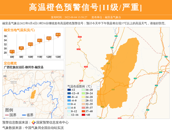 融安县气象台2022年8月4日13时58分继续发布高温橙色预警信号:预计今天中下午我县将出现37℃以上的高温天气,请做好防范。 信息来源:国家预警信息发布中心; 发布单位:融安县气象台。