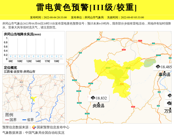 井冈山市气象台2022年08月04日20时33分发布雷电黄色预警信号:预计未来6小时内,我市部分乡镇有雷电活动,局地伴有短时强降水、雷暴大风等强对流天气,请注意防范。 信息来源:国家预警信息发布中心; 发布单位:井冈山市气象局。