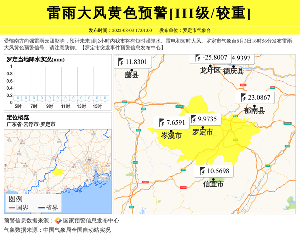 受郁南方向强雷雨云团影响,预计未来1到2小时内我市将有短时强降水、雷电和短时大风。罗定市气象台8月3日16时56分发布雷雨大风黄色预警信号,请注意防御。【罗定市突发事件预警信息发布中心】 信息来源:国家预警信息发布中心; 发布单位:罗定市气象台。