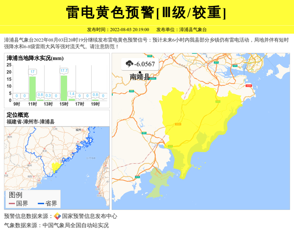 漳浦县气象台2022年08月03日20时19分继续发布雷电黄色预警信号:预计未来6小时内我县部分乡镇仍有雷电活动,局地并伴有短时强降水和6-8级雷雨大风等强对流天气。请注意防范! 信息来源:国家预警信息发布中心; 发布单位:漳浦县气象台。