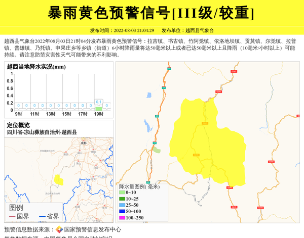 越西县气象台2022年08月03日21时04分发布暴雨黄色预警信号:拉吉镇、书古镇、竹阿觉镇、依洛地坝镇、贡莫镇、尔觉镇、拉普镇、普雄镇、乃托镇、申果庄乡等乡镇(街道)6小时降雨量将达50毫米以上或者已达50毫米以上且降雨(10毫米/小时以上)可能持续。请注意防范灾害性天气可能带来的不利影响。 信息来源:国家预警信息发布中心; 发布单位:越西县气象台。