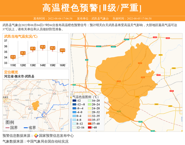 武邑县气象台2022年08月04日17时06分发布高温橙色预警信号:预计明天白天武邑县将受高温天气影响,大部地区最高气温可达37℃以上,请有关单位和人员做好防范准备。 信息来源:国家预警信息发布中心; 发布单位:武邑县气象台。