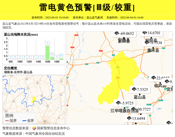 蓝山县气象台2022年8月3日19时10分发布雷电黄色预警信号:预计蓝山县未来6小时将发生雷电活动,可能出现雷电灾害事故,请加强防范。 信息来源:国家预警信息发布中心; 发布单位:蓝山县气象局。