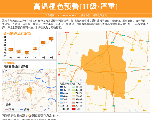 通许县气象台2022年8月4日09时55分发布高温橙色预警信号:预计未来24小时,通许县咸平街道、竖岗镇、玉皇庙镇、四所楼镇、朱砂镇、长智镇、冯庄乡、孙营乡、大岗李乡、邸阁乡、练城乡、厉庄乡等全部乡镇和街道最高气温将升至37℃以上。各级党委政府、行业主管部门研判本地、本行业风险,启动预案。 信息来源:国家预警信息发布中心; 发布单位:通许县气象台。