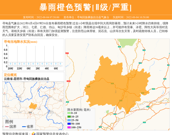 寻甸县气象台2022年8月4日07时58分发布暴雨橙色预警:过去1小时我县出现中到大雨局部暴雨,预计未来3小时降水仍将持续,强降雨范围将扩大,河口、七星、仁德、功山、甸沙等乡镇(街道)降雨将达50毫米以上,并可能伴有雷暴、冰雹、阵性大风等强对流天气。请相关乡镇(街道)和有关部门加强监测预警,注意防范山体滑坡、泥石流、山洪等次生灾害,及时疏散转移人员,已转移的人员要妥善安置严防私自回流,确保安全。 信息来源:国家预警信息发布中心; 发布单位:寻甸回族彝族自治县气象台。
