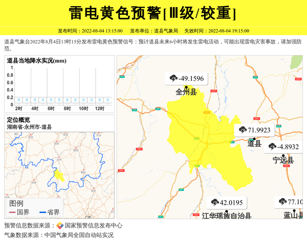 道县气象台2022年8月4日13时15分发布雷电黄色预警信号:预计道县未来6小时将发生雷电活动,可能出现雷电灾害事故,请加强防范。 信息来源:国家预警信息发布中心; 发布单位:道县气象局。