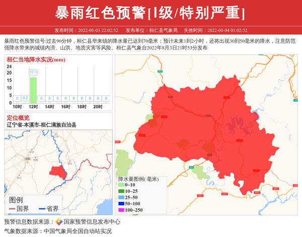 暴雨红色预警信号:过去90分钟,桓仁县华来镇的降水量已达到70毫米;预计未来1到2小时,还将出现30到50毫米的降水,注意防范强降水带来的城镇内涝、山洪、地质灾害等风险。桓仁县气象台2022年8月3日21时53分发布 信息来源:国家预警信息发布中心; 发布单位:桓仁县气象局。