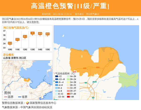 河口区气象台2022年08月04日15时58分继续发布高温橙色预警信号:预计8月5日,我区全部乡镇和街道日最高气温可达37℃以上,6日和7日均在35℃以上。请注意防范。 信息来源:国家预警信息发布中心; 发布单位:河口区气象台。