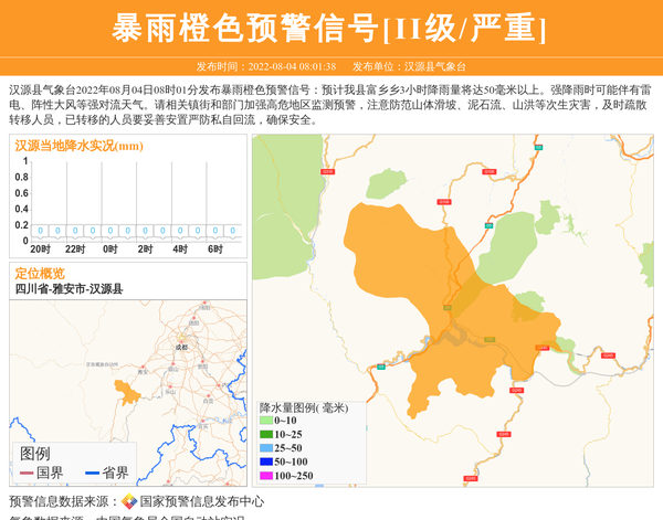 汉源县气象台2022年08月04日08时01分发布暴雨橙色预警信号:预计我县富乡乡3小时降雨量将达50毫米以上。强降雨时可能伴有雷电、阵性大风等强对流天气。请相关镇街和部门加强高危地区监测预警,注意防范山体滑坡、泥石流、山洪等次生灾害,及时疏散转移人员,已转移的人员要妥善安置严防私自回流,确保安全。 信息来源:国家预警信息发布中心; 发布单位:汉源县气象台。