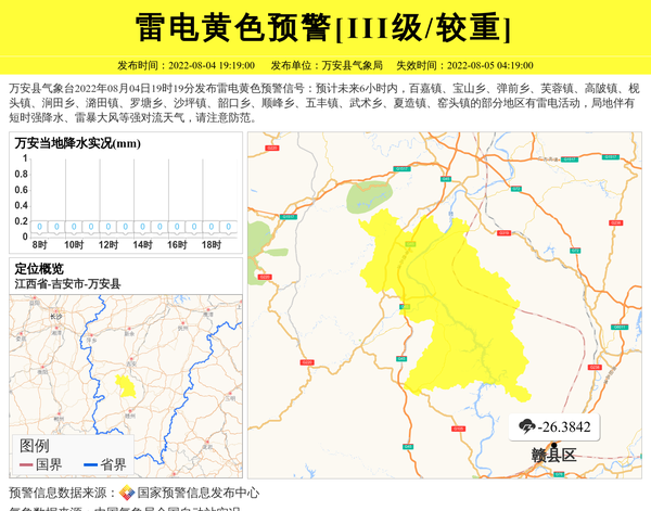万安县气象台2022年08月04日19时19分发布雷电黄色预警信号:预计未来6小时内,百嘉镇、宝山乡、弹前乡、芙蓉镇、高陂镇、枧头镇、涧田乡、潞田镇、罗塘乡、沙坪镇、韶口乡、顺峰乡、五丰镇、武术乡、夏造镇、窑头镇的部分地区有雷电活动,局地伴有短时强降水、雷暴大风等强对流天气,请注意防范。 信息来源:国家预警信息发布中心; 发布单位:万安县气象局。