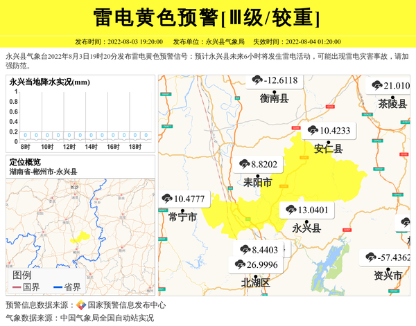永兴县气象台2022年8月3日19时20分发布雷电黄色预警信号:预计永兴县未来6小时将发生雷电活动,可能出现雷电灾害事故,请加强防范。 信息来源:国家预警信息发布中心; 发布单位:永兴县气象局。