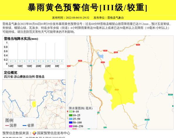 普格县气象台2022年08月04日01时29分发布暴雨黄色预警信号:过去60分钟普格县螺髻山德育降雨量已达35.2mm,预计五道箐镇、夹铁镇、螺髻山镇、瓦洛乡、特兹乡等乡镇(街道)6小时降雨量将达50毫米以上或者已达50毫米以上且降雨(10毫米/小时以上)可能持续。请注意防范灾害性天气可能带来的不利影响。 信息来源:国家预警信息发布中心; 发布单位:普格县气象台。