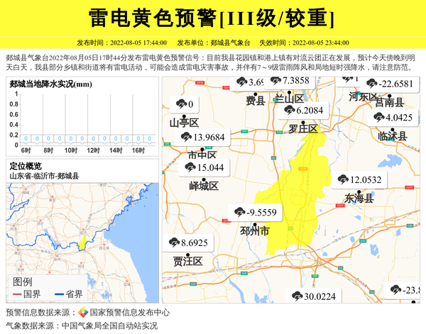 郯城县气象台2022年08月05日17时44分发布雷电黄色预警信号:目前我县花园镇和港上镇有对流云团正在发展,预计今天傍晚到明天白天,我县部分乡镇和街道将有雷电活动,可能会造成雷电灾害事故,并伴有7~9级雷雨阵风和局地短时强降水,请注意防范。 信息来源:国家预警信息发布中心; 发布单位:郯城县气象台。