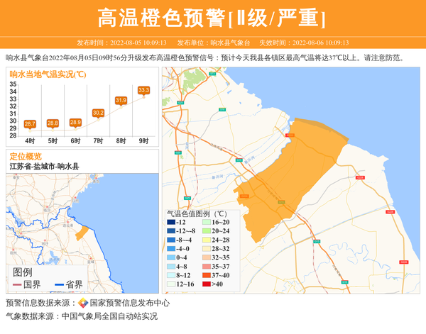响水县气象台2022年08月05日09时56分升级发布高温橙色预警信号:预计今天我县各镇区最高气温将达37℃以上。请注意防范。 信息来源:国家预警信息发布中心; 发布单位:响水县气象台。