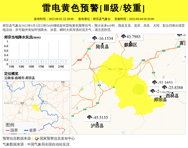 师宗县气象台2022年8月3日22时20分继续发布雷电黄色预警信号:预计未来6小时,我县五龙、龙庆、高良、大同、彩云仍将出现雷电活动,并可能伴有短时强降水、冰雹、瞬时大风等强对流天气,请注意防范。 信息来源:国家预警信息发布中心; 发布单位:师宗县气象台。