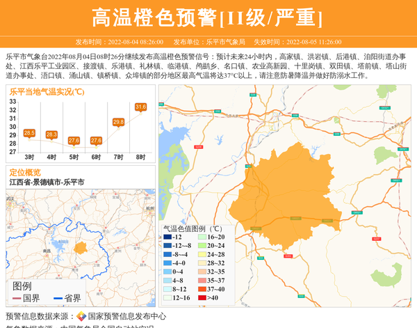 乐平市气象台2022年08月04日08时26分继续发布高温橙色预警信号:预计未来24小时内,高家镇、洪岩镇、后港镇、洎阳街道办事处、江西乐平工业园区、接渡镇、乐港镇、礼林镇、临港镇、鸬鹚乡、名口镇、农业高新园、十里岗镇、双田镇、塔前镇、塔山街道办事处、浯口镇、涌山镇、镇桥镇、众埠镇的部分地区最高气温将达37°C以上,请注意防暑降温并做好防溺水工作。 信息来源:国家预警信息发布中心; 发布单位:乐平市气象局。