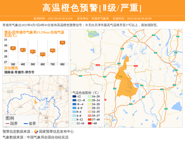 常德市气象台2022年8月5日8时45分发布高温橙色预警信号:今天白天津市最高气温将升至37℃以上,请加强防范。 信息来源:国家预警信息发布中心; 发布单位:常德市气象局。