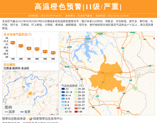 东乡区气象台2022年08月05日07时05分继续发布高温橙色预警信号:预计未来24小时内,邓家乡、甘坑林场、虎圩乡、黎圩镇、马圩镇、珀玕乡、王桥镇、圩上桥镇、小璜镇、孝岗镇、杨桥殿镇、瑶圩乡、詹圩镇的部分地区最高气温将达37°C以上,请注意防暑降温。 信息来源:国家预警信息发布中心; 发布单位:东乡区气象局。