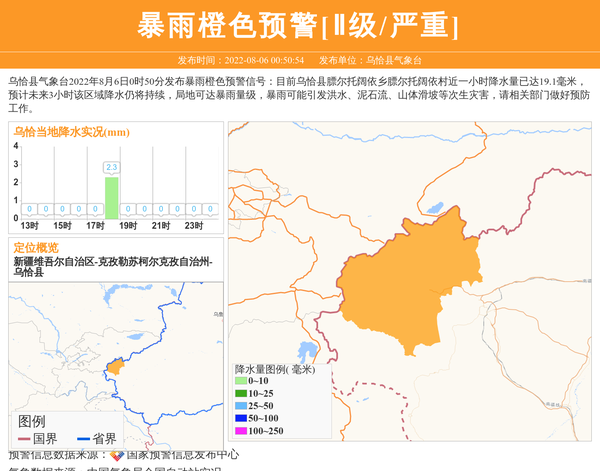乌恰县气象台2022年8月6日0时50分发布暴雨橙色预警信号:目前乌恰县膘尔托阔依乡膘尔托阔依村近一小时降水量已达19.1毫米,预计未来3小时该区域降水仍将持续,局地可达暴雨量级,暴雨可能引发洪水、泥石流、山体滑坡等次生灾害,请相关部门做好预防工作。 信息来源:国家预警信息发布中心; 发布单位:乌恰县气象台。