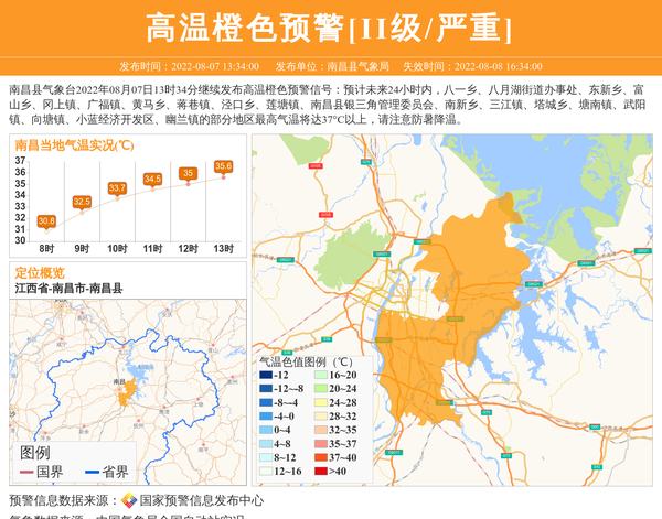 南昌县气象台2022年08月07日13时34分继续发布高温橙色预警信号:预计未来24小时内,八一乡、八月湖街道办事处、东新乡、富山乡、冈上镇、广福镇、黄马乡、蒋巷镇、泾口乡、莲塘镇、南昌县银三角管理委员会、南新乡、三江镇、塔城乡、塘南镇、武阳镇、向塘镇、小蓝经济开发区、幽兰镇的部分地区最高气温将达37°C以上,请注意防暑降温。 信息来源:国家预警信息发布中心; 发布单位:南昌县气象局。