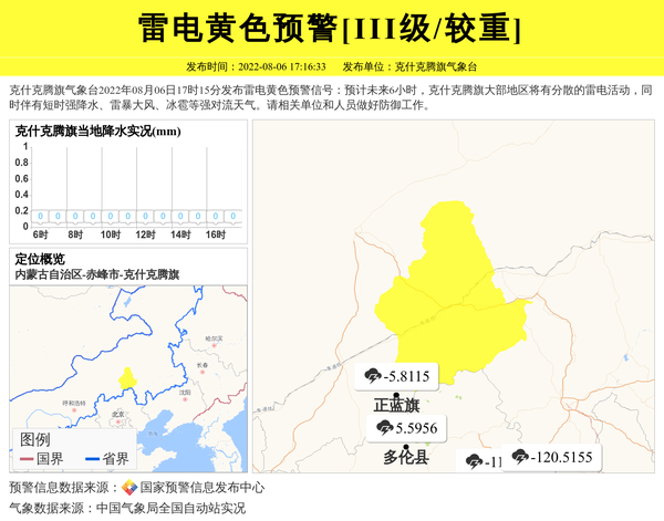 克什克腾旗气象台2022年08月06日17时15分发布雷电黄色预警信号:预计未来6小时,克什克腾旗大部地区将有分散的雷电活动,同时伴有短时强降水、雷暴大风、冰雹等强对流天气。请相关单位和人员做好防御工作。 信息来源:国家预警信息发布中心; 发布单位:克什克腾旗气象台。