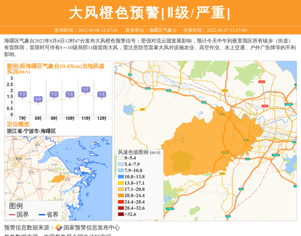 海曙区气象台2022年8月6日12时47分发布大风橙色预警信号:受强对流云团发展影响,预计今天中午到夜里我区所有镇乡(街道)有雷阵雨,雷雨时可伴有8~10级局部11级雷雨大风,需注意防范雷暴大风对设施农业、高空作业、水上交通、户外广告牌等的不利影响。 信息来源:国家预警信息发布中心; 发布单位:海曙区气象台。