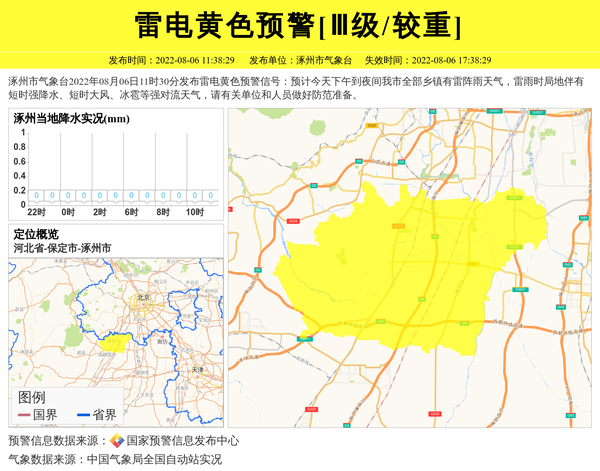 涿州市气象台2022年08月06日11时30分发布雷电黄色预警信号:预计今天下午到夜间我市全部乡镇有雷阵雨天气,雷雨时局地伴有短时强降水、短时大风、冰雹等强对流天气,请有关单位和人员做好防范准备。 信息来源:国家预警信息发布中心; 发布单位:涿州市气象台。