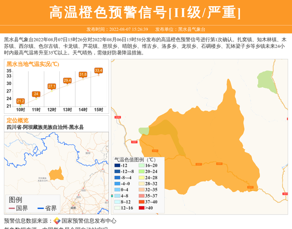 黑水县气象台2022年08月07日15时26分对2022年08月06日15时58分发布的高温橙色预警信号进行第1次确认。扎窝镇、知木林镇、木苏镇、西尔镇、色尔古镇、卡龙镇、芦花镇、慈坝乡、晴朗乡、维古乡、洛多乡、龙坝乡、石碉楼乡、瓦钵梁子乡等乡镇未来24小时内最高气温将升至35℃以上。天气晴热,需做好防暑降温措施。 信息来源:国家预警信息发布中心; 发布单位:黑水县气象台。