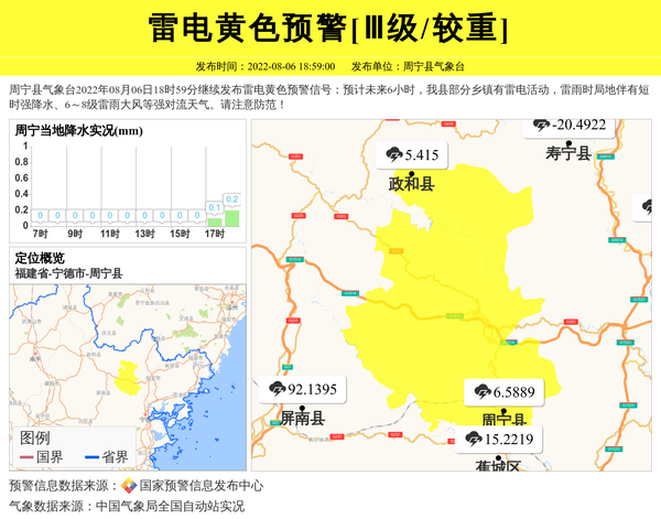 周宁县气象台2022年08月06日18时59分继续发布雷电黄色预警信号:预计未来6小时,我县部分乡镇有雷电活动,雷雨时局地伴有短时强降水、6~8级雷雨大风等强对流天气。请注意防范! 信息来源:国家预警信息发布中心; 发布单位:周宁县气象台。