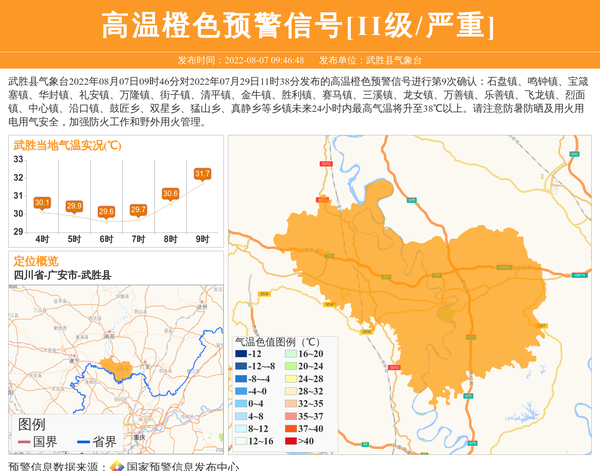 武胜县气象台2022年08月07日09时46分对2022年07月29日11时38分发布的高温橙色预警信号进行第9次确认:石盘镇、鸣钟镇、宝箴塞镇、华封镇、礼安镇、万隆镇、街子镇、清平镇、金牛镇、胜利镇、赛马镇、三溪镇、龙女镇、万善镇、乐善镇、飞龙镇、烈面镇、中心镇、沿口镇、鼓匠乡、双星乡、猛山乡、真静乡等乡镇未来24小时内最高气温将升至38℃以上。请注意防暑防晒及用火用电用气安全,加强防火工作和野外用火管理。 信息来源:国家预警信息发布中心; 发布单位:武胜县气象台。