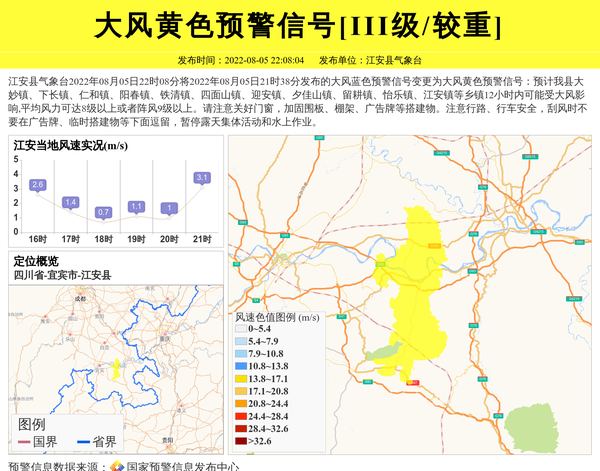 江安县气象台2022年08月05日22时08分将2022年08月05日21时38分发布的大风蓝色预警信号变更为大风黄色预警信号:预计我县大妙镇、下长镇、仁和镇、阳春镇、铁清镇、四面山镇、迎安镇、夕佳山镇、留耕镇、怡乐镇、江安镇等乡镇12小时内可能受大风影响,平均风力可达8级以上或者阵风9级以上。请注意关好门窗,加固围板、棚架、广告牌等搭建物。注意行路、行车安全,刮风时不要在广告牌、临时搭建物等下面逗留,暂停露天集体活动和水上作业。 信息来源:国家预警信息发布中心; 发布单位:江安县气象台。
