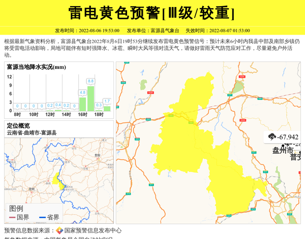 根据最新气象资料分析,富源县气象台2022年8月6日19时53分继续发布雷电黄色预警信号:预计未来6小时内我县中部及南部乡镇仍将受雷电活动影响,局地可能伴有短时强降水、冰雹、瞬时大风等强对流天气,请做好雷雨天气防范应对工作,尽量避免户外活动。 信息来源:国家预警信息发布中心; 发布单位:富源县气象台。