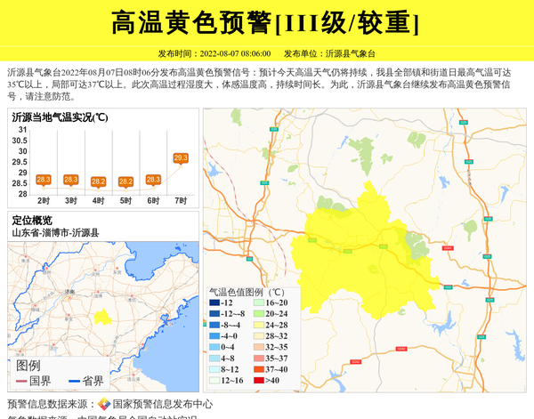 沂源县气象台2022年08月07日08时06分发布高温黄色预警信号:预计今天高温天气仍将持续,我县全部镇和街道日最高气温可达35℃以上,局部可达37℃以上。此次高温过程湿度大,体感温度高,持续时间长。为此,沂源县气象台继续发布高温黄色预警信号,请注意防范。 信息来源:国家预警信息发布中心; 发布单位:沂源县气象台。