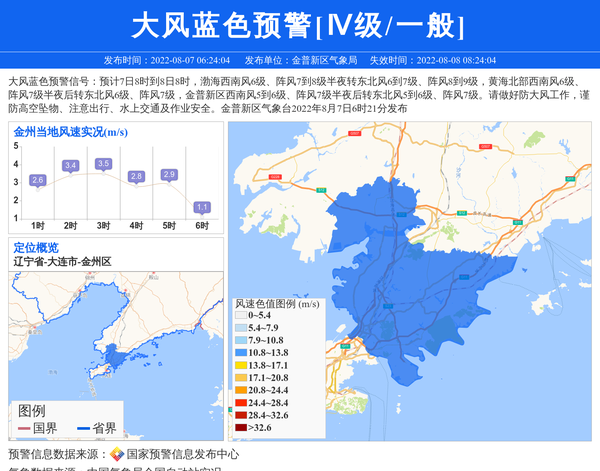 大风蓝色预警信号:预计7日8时到8日8时,渤海西南风6级、阵风7到8级半夜转东北风6到7级、阵风8到9级,黄海北部西南风6级、阵风7级半夜后转东北风6级、阵风7级,金普新区西南风5到6级、阵风7级半夜后转东北风5到6级、阵风7级。请做好防大风工作,谨防高空坠物、注意出行、水上交通及作业安全。金普新区气象台2022年8月7日6时21分发布 信息来源:国家预警信息发布中心; 发布单位:金普新区气象局。
