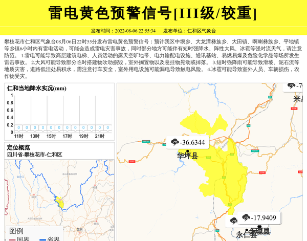 攀枝花市仁和区气象台08月06日22时55分发布雷电黄色预警信号:预计我区中坝乡、大龙潭彝族乡、大田镇、啊喇彝族乡、平地镇等乡镇6小时内有雷电活动,可能会造成雷电灾害事故,同时部分地方可能伴有短时强降水、阵性大风、冰雹等强对流天气,请注意防范。 1.雷电可能导致高层建筑电梯、人员活动的露天空旷地带、电力输配电设施、通讯基站、易燃易爆及危险化学品等场所发生雷击事故。 2.大风可能导致部分临时搭建物吹动损毁,室外搁置物以及悬挂物晃动或掉落。 3.短时强降雨可能导致滑坡、泥石流等地质灾害,道路低洼处易积水,需注意行车安全,室外用电设施可能漏电导致触电风险。 4.冰雹可能导致室外人员、车辆损伤,农作物受灾。 信息来源:国家预警信息发布中心; 发布单位:仁和区气象台。
