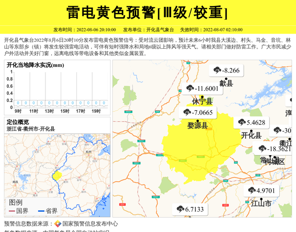开化县气象台2022年8月6日20时10分发布雷电黄色预警信号:受对流云团影响,预计未来6小时我县大溪边、村头、马金、音坑、林山等东部乡(镇)将发生较强雷电活动,可伴有短时强降水和局地6级以上阵风等强天气。请相关部门做好防雷工作。广大市民减少户外活动并关好门窗,远离电线等带电设备和其他类似金属装置。 信息来源:国家预警信息发布中心; 发布单位:开化县气象台。