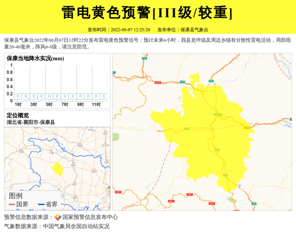 保康县气象台2022年08月07日12时22分发布雷电黄色预警信号:预计未来6小时,我县龙坪镇及周边乡镇有分散性雷电活动,局部雨量20-40毫米,阵风6-8级,请注意防范。 信息来源:国家预警信息发布中心; 发布单位:保康县气象台。
