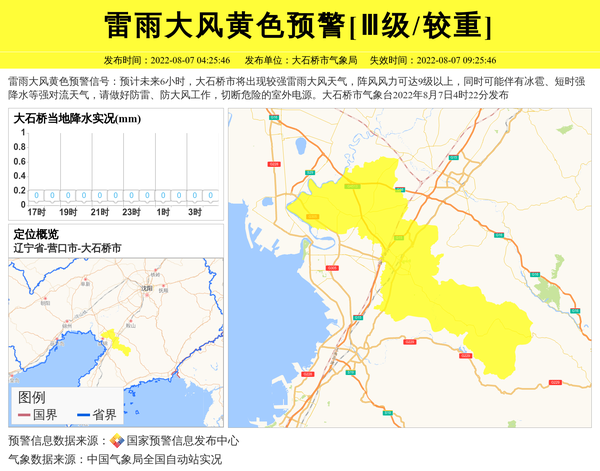 雷雨大风黄色预警信号:预计未来6小时,大石桥市将出现较强雷雨大风天气,阵风风力可达9级以上,同时可能伴有冰雹、短时强降水等强对流天气,请做好防雷、防大风工作,切断危险的室外电源。大石桥市气象台2022年8月7日4时22分发布 信息来源:国家预警信息发布中心; 发布单位:大石桥市气象局。