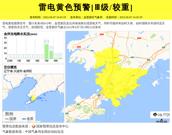雷电黄色预警信号:预计未来4到6小时,金普新区及沿岸海域将出现雷电天气,同时可能伴有短时大风、短时强降水等强对流天气,请密切关注天气,加强防范。金普新区气象台2022年8月7日10时42分发布 信息来源:国家预警信息发布中心; 发布单位:金普新区气象局。