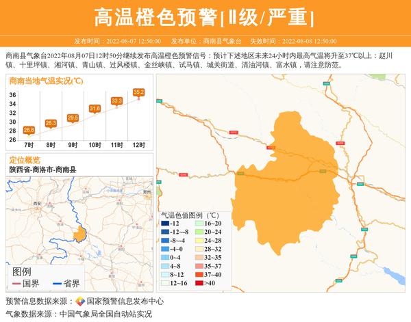 商南县气象台2022年08月07日12时50分继续发布高温橙色预警信号:预计下述地区未来24小时内最高气温将升至37℃以上:赵川镇、十里坪镇、湘河镇、青山镇、过风楼镇、金丝峡镇、试马镇、城关街道、清油河镇、富水镇,请注意防范。 信息来源:国家预警信息发布中心; 发布单位:商南县气象台。