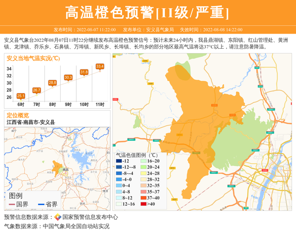 安义县气象台2022年08月07日11时22分继续发布高温橙色预警信号:预计未来24小时内,我县鼎湖镇、东阳镇、红山管理处、黄洲镇、龙津镇、乔乐乡、石鼻镇、万埠镇、新民乡、长埠镇、长均乡的部分地区最高气温将达37°C以上,请注意防暑降温。 信息来源:国家预警信息发布中心; 发布单位:安义县气象局。