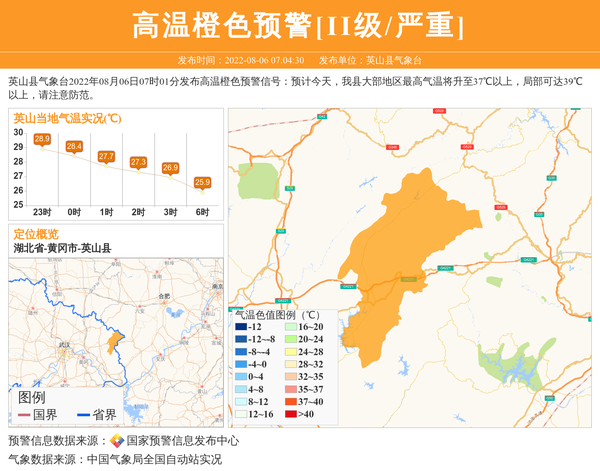 英山县气象台2022年08月06日07时01分发布高温橙色预警信号:预计今天,我县大部地区最高气温将升至37℃以上,局部可达39℃以上,请注意防范。 信息来源:国家预警信息发布中心; 发布单位:英山县气象台。