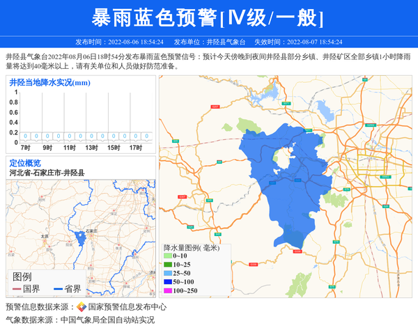 井陉县气象台2022年08月06日18时54分发布暴雨蓝色预警信号:预计今天傍晚到夜间井陉县部分乡镇、井陉矿区全部乡镇1小时降雨量将达到40毫米以上,请有关单位和人员做好防范准备。 信息来源:国家预警信息发布中心; 发布单位:井陉县气象台。